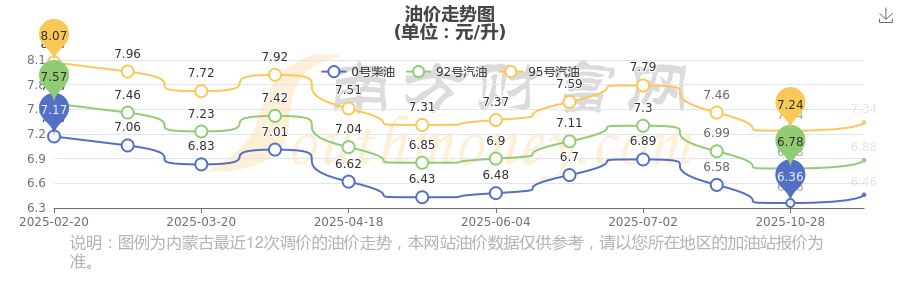 11月15日內(nèi)蒙古赤峰92號汽油的價格為6.88元每升,本次調(diào)整時間為11月11日,相對上次調(diào)整時間10月28日的油價6.78元每升,上調(diào)了0.1元,上調(diào)幅達(dá)1.475%。下一輪油價調(diào)整時間11月24日24時,距離現(xiàn)在還有9.12天。