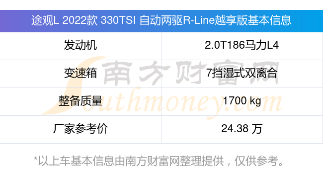 途觀L 2022款 330TSI 自動(dòng)兩驅(qū)R-Line越享版搭載了一臺(tái)2.0T186馬力L4渦輪增壓發(fā)動(dòng)機(jī),采用7擋濕式雙離合自動(dòng)檔變速箱,常規(guī)整備質(zhì)量1700kg,廠家參考價(jià)24.38萬(wàn)元。