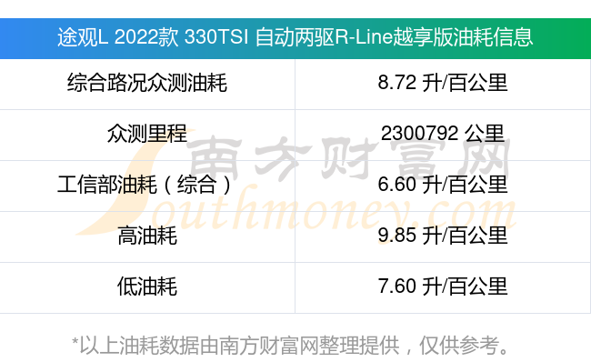 根據(jù)多位車主實(shí)測(cè)得出數(shù)據(jù),該車型低油耗為7.60升/百公里,高油耗為9.85升/百公里,綜合路況眾測(cè)油耗為8.72升/百公里,工信部綜合油耗為6.60升/百公里。