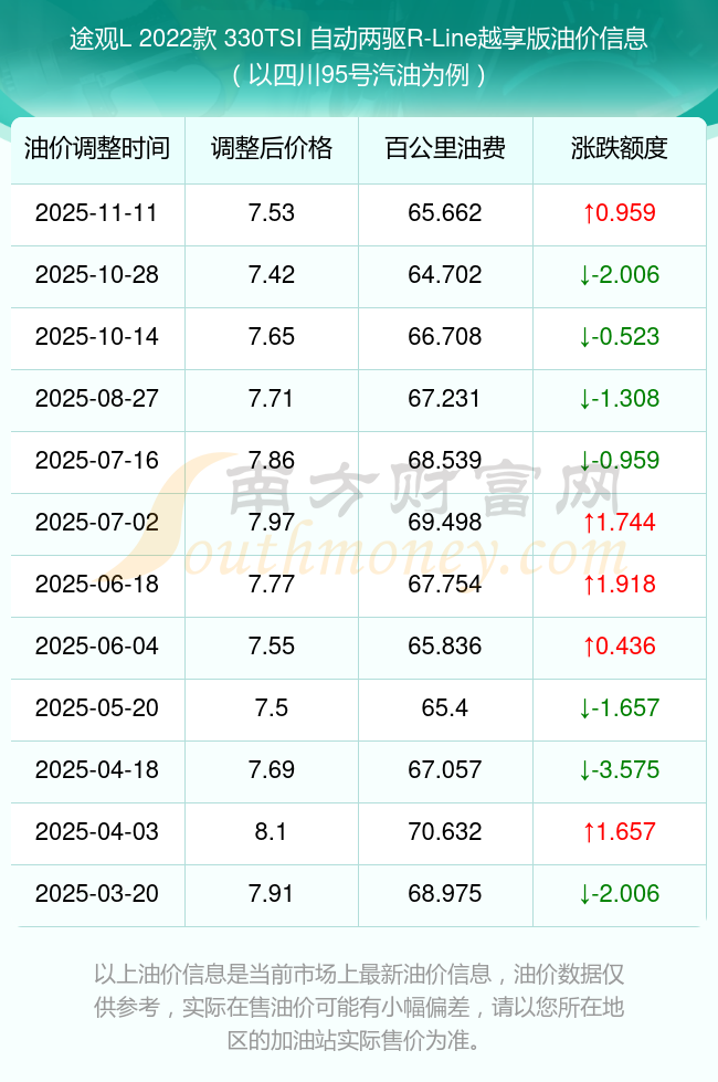 按11月11日95號(hào)汽油最新調(diào)整價(jià)格7.53元每升來(lái)計(jì)算(以四川為例),該車型百公里平均油費(fèi)為65.662元,按上一輪10月28日調(diào)整價(jià)格7.42元每升來(lái)計(jì)算,百公里平均油費(fèi)為64.702元,對(duì)比上一輪多花0.959元,下一輪油價(jià)調(diào)整時(shí)間為11月24日24時(shí)。