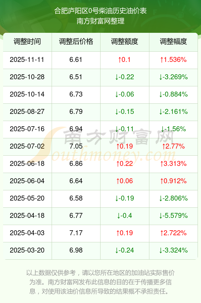 合肥廬陽區(qū)11月15日0號柴油歷史油價調(diào)整一覽表