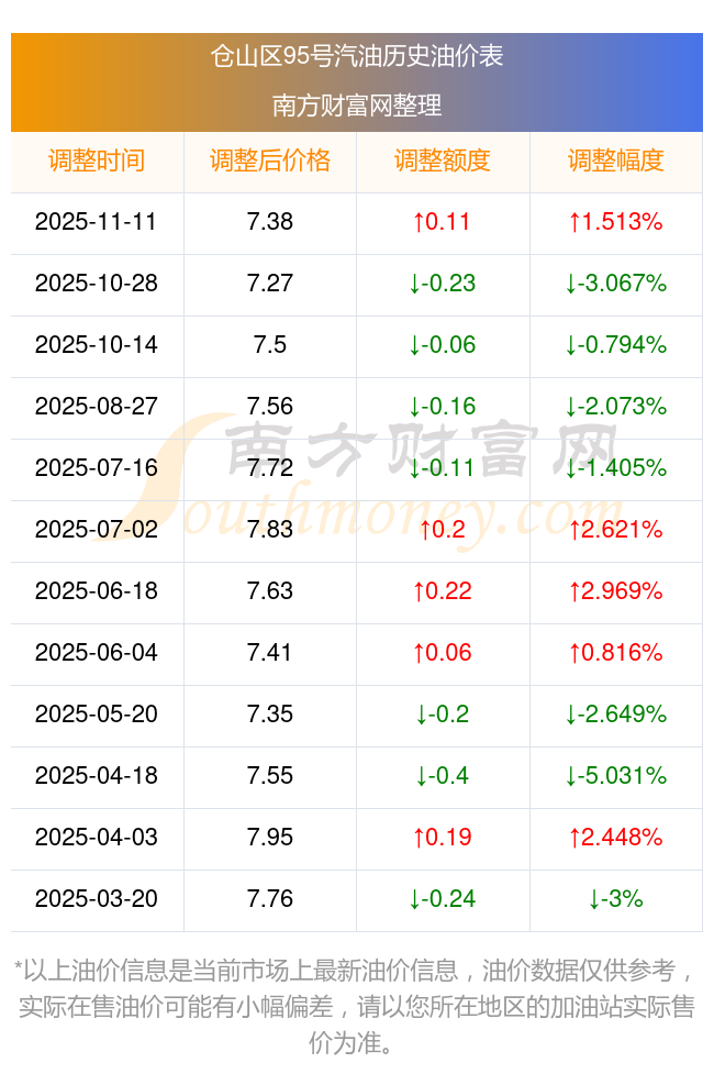 11月15日倉山區(qū)95號汽油歷史油價調(diào)整一覽表