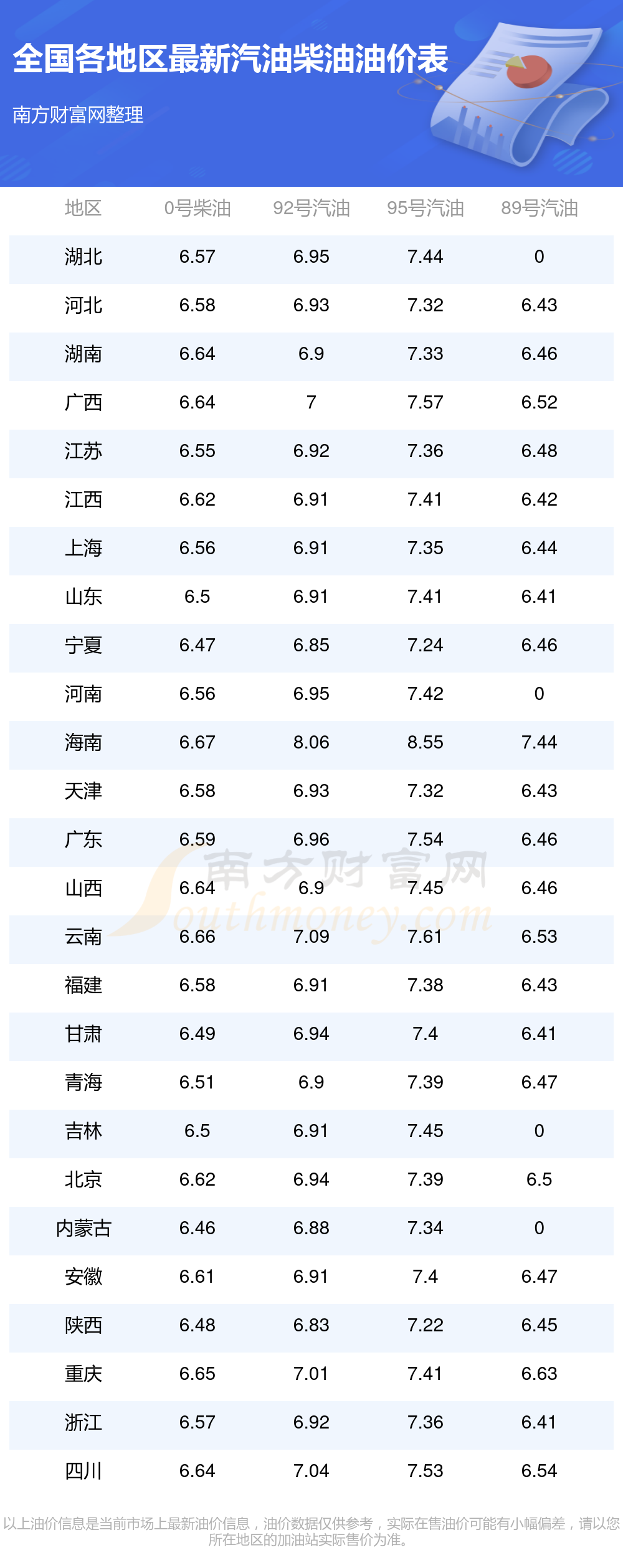 油價(jià)數(shù)據(jù)僅供參考,請(qǐng)以您所在地區(qū)的加油站報(bào)價(jià)為準(zhǔn)。南方財(cái)富網(wǎng)發(fā)布此信息的目的在于傳播更多信息,對(duì)使用該油價(jià)信息所導(dǎo)致的結(jié)果概不承擔(dān)任何責(zé)任。