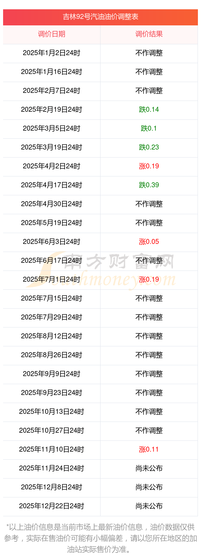 這一輪油價調整的時間是11月11日,調整后全國油價的具體價格為:92號汽油平均價格為7元每升,其中,最低的是陜西,6.83元每升,最高的是海南,8.06元每升。95號汽油平均價格為7元每升,其中,最低的是陜西,7.22元每升,最高的是海南,8.55元每升。0號柴油平均價格為:7元每升,其中,最低的是內蒙古,6.46元每升,最高的是海南,6.67元每升。89號汽油平均價格為7元每升,其中,最低的是浙江,6.41元每升,最高的是海南,7.44元每升。下一輪油價調整時間11月24日24時,距離現在還有8.76天。