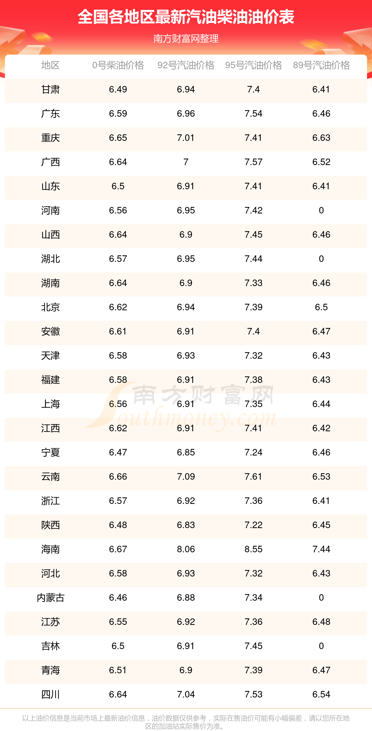 以上數(shù)據(jù)僅供參考,請以您所在地區(qū)的加油站實際售價為準。南方財富網(wǎng)發(fā)布此信息的目的在于傳播更多信息,對使用該油價信息所導(dǎo)致的結(jié)果概不承擔責任。