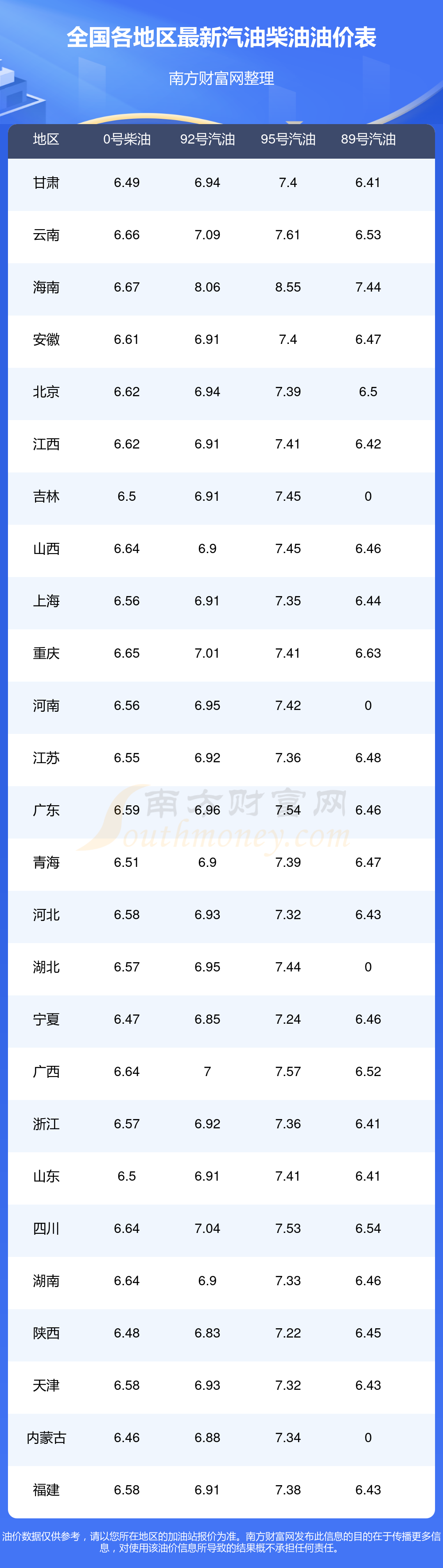 以上數(shù)據(jù)僅供參考,請(qǐng)以您所在地區(qū)的加油站實(shí)際售價(jià)為準(zhǔn)。南方財(cái)富網(wǎng)發(fā)布此信息的目的在于傳播更多信息,對(duì)使用該油價(jià)信息所導(dǎo)致的結(jié)果概不承擔(dān)責(zé)任。