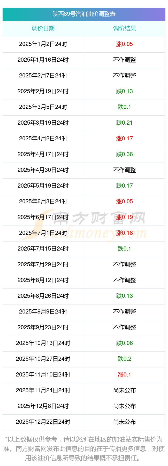 陜西89號(hào)汽油油價(jià)調(diào)整表