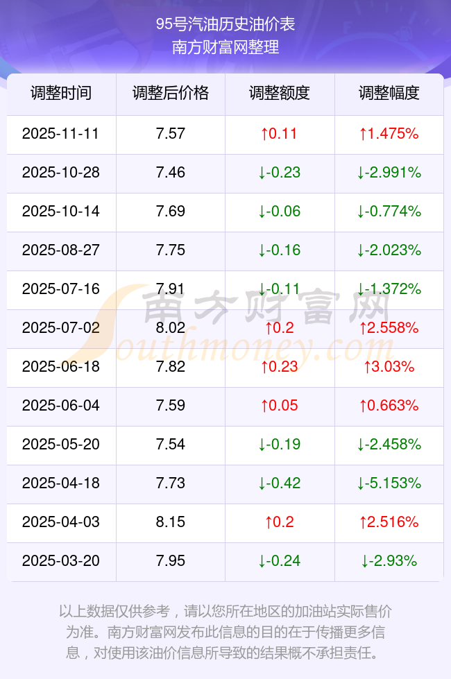 以上數(shù)據(jù)僅供參考,請(qǐng)以您所在地區(qū)的加油站實(shí)際售價(jià)為準(zhǔn)。南方財(cái)富網(wǎng)發(fā)布此信息的目的在于傳播更多信息,對(duì)使用該油價(jià)信息所導(dǎo)致的結(jié)果概不承擔(dān)責(zé)任。