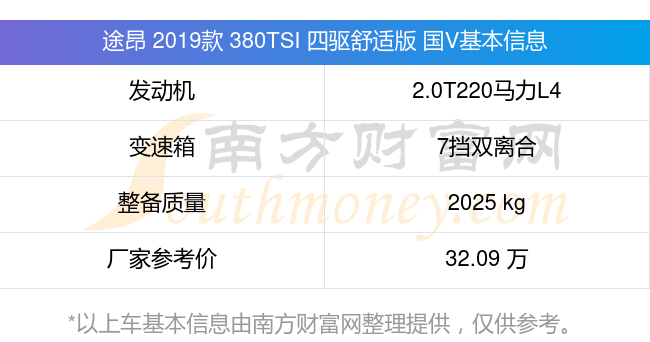 在動(dòng)力方面,途昂 2019款 380TSI 四驅(qū)舒適版 國(guó)V搭載的是一臺(tái)2.0T220馬力L4渦輪增壓發(fā)動(dòng)機(jī),匹配7擋雙離合自動(dòng)檔變速箱,燃料形式為汽油,常規(guī)整備質(zhì)量2025kg,廠家參考價(jià)32.09萬元。