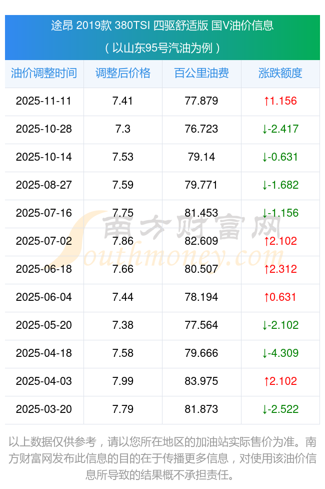 按11月11日95號(hào)汽油最新調(diào)整價(jià)格7.41元每升來計(jì)算(以山東為例),該車型百公里平均油費(fèi)為77.879元,按上一輪10月28日調(diào)整價(jià)格7.3元每升來計(jì)算,百公里平均油費(fèi)為76.723元,對(duì)比上一輪多花1.156元,下一輪油價(jià)調(diào)整時(shí)間為11月24日24時(shí)。
