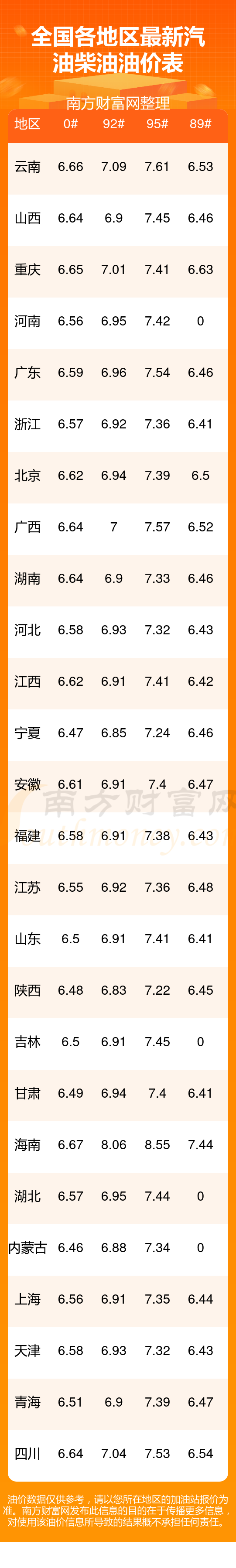 全國0號柴油平均價格為:7元每升,其中,最低為內(nèi)蒙古,價格6.46元/升,最高為海南,價格6.67元/升。