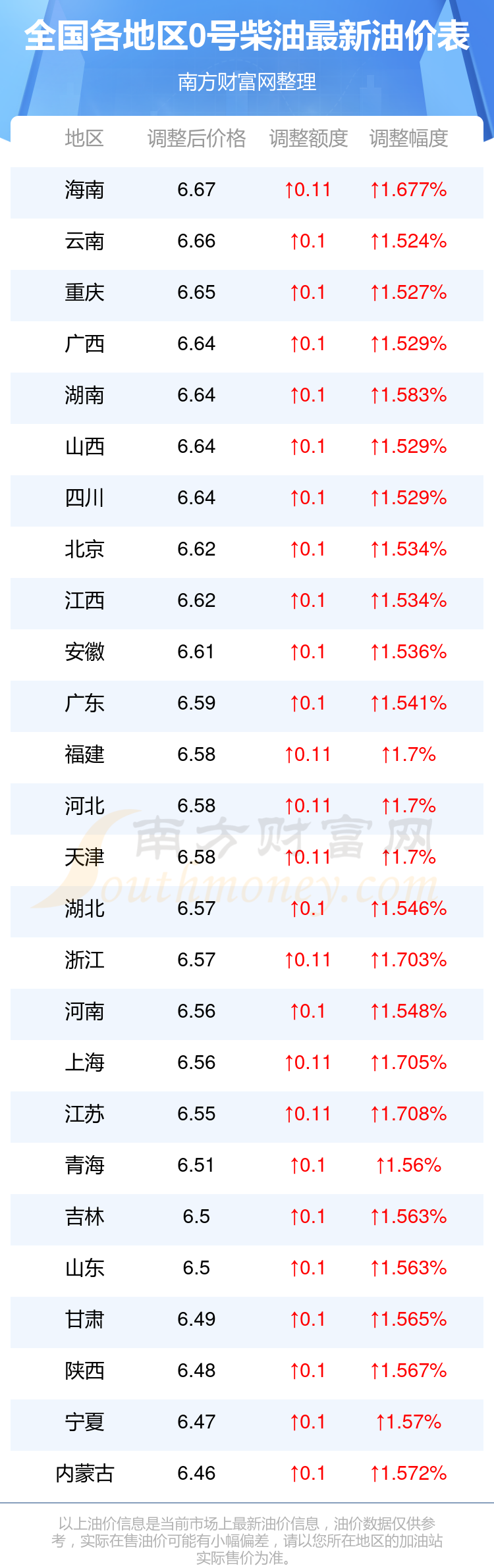 11月16日,湖南0號柴油的價格是6.64元每升,本次的調(diào)整時間為11月11日,對比上次的調(diào)整增了0.1元,增1.583%,11月24日24時為下一輪油價調(diào)整時間,還有8.68天。