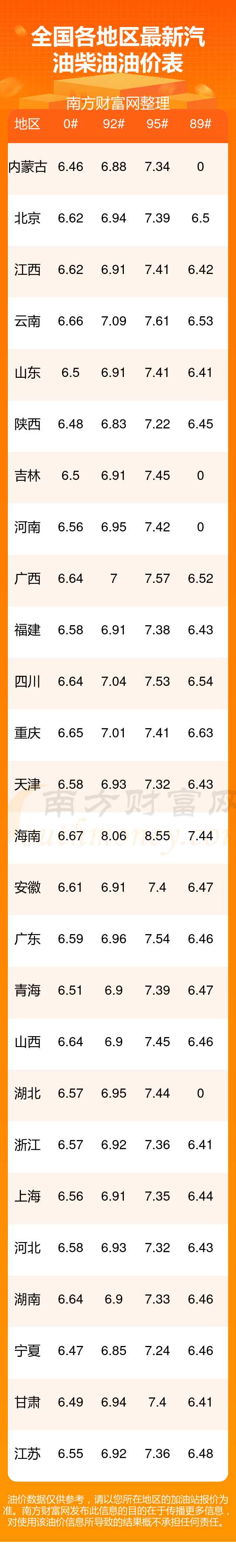 全國0號柴油最新平均價格為:7元每升,其中,最低為內蒙古,價格為6.46元/升,最高為海南,價格為6.67元/升。