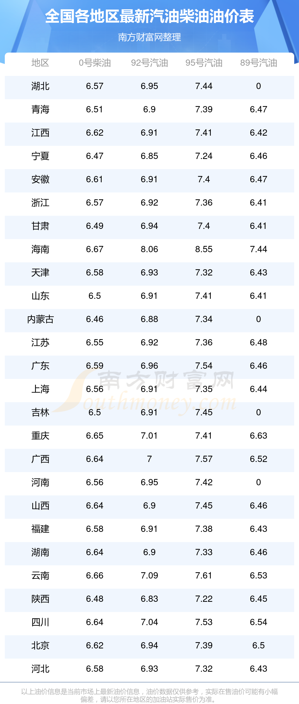 以上油價(jià)信息是當(dāng)前市場上最新油價(jià)信息,油價(jià)數(shù)據(jù)僅供參考,實(shí)際在售油價(jià)可能有小幅偏差,請(qǐng)以您所在地區(qū)的加油站實(shí)際售價(jià)為準(zhǔn)。