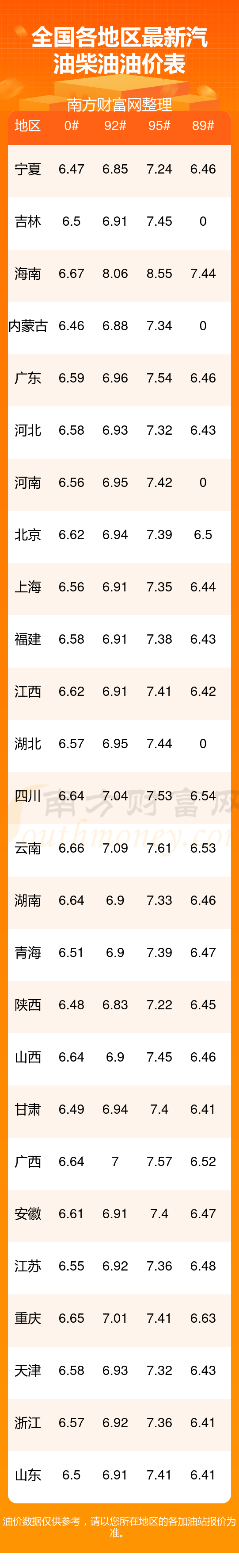 2025年全國各地區(qū)最新油價(jià)表