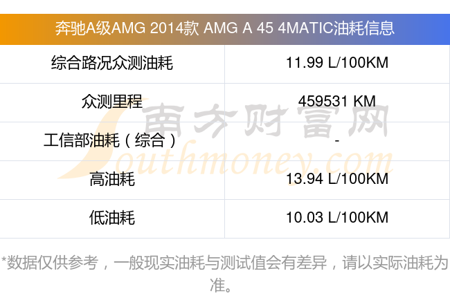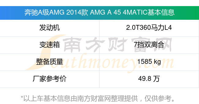 奔馳A級(jí)AMG 2014款 AMG A 45 4MATIC動(dòng)力上搭載的是一臺(tái)2.0T360馬力L4渦輪增壓發(fā)動(dòng)機(jī),匹配7擋雙離合自動(dòng)檔變速箱,燃料形式為汽油,常規(guī)整備質(zhì)量1585kg,廠家參考價(jià)49.8萬(wàn)元。