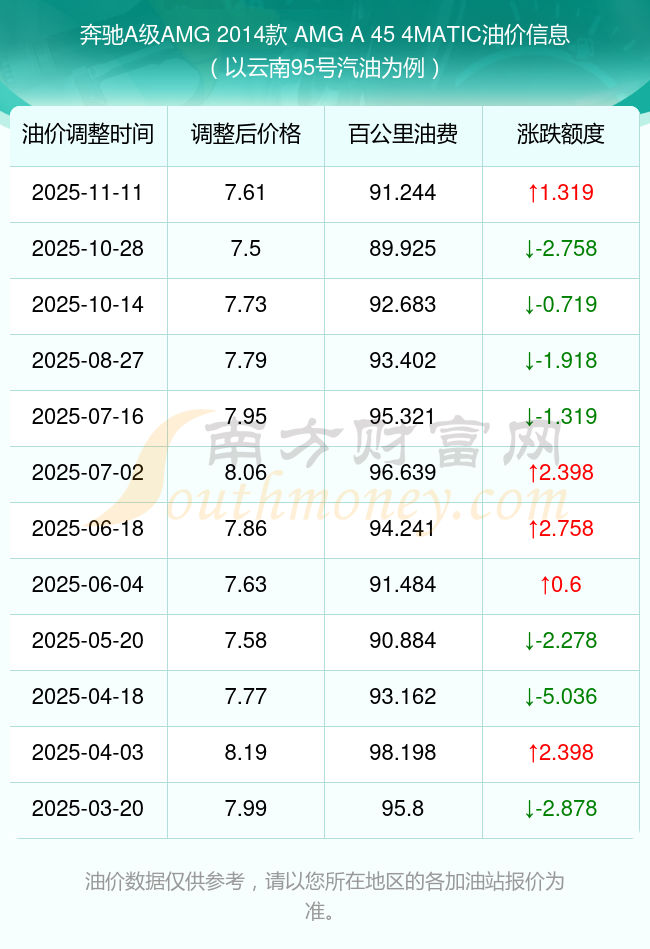 按11月11日95號(hào)汽油最新調(diào)整價(jià)格7.61元每升來(lái)計(jì)算(以云南為例),該車(chē)型百公里平均油費(fèi)為91.244元,按上一輪10月28日調(diào)整價(jià)格7.5元每升來(lái)計(jì)算,百公里平均油費(fèi)為89.925元,對(duì)比上一輪多花1.319元,下一輪油價(jià)調(diào)整時(shí)間為11月24日24時(shí)。