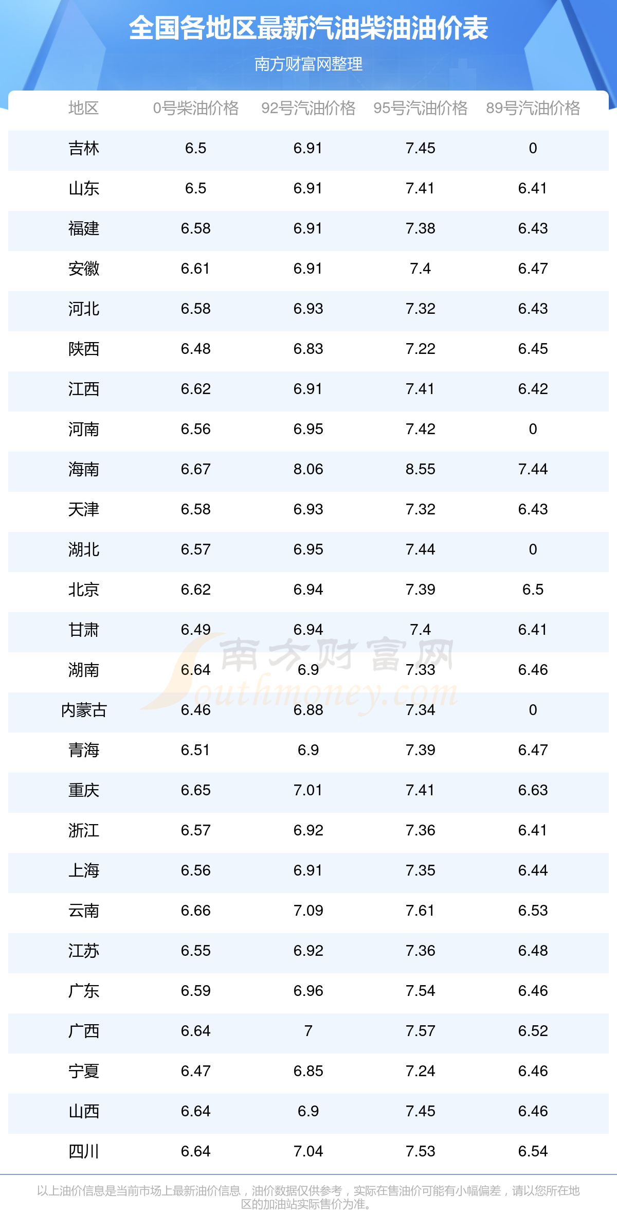 油價(jià)數(shù)據(jù)僅供參考,請(qǐng)以您所在地區(qū)的加油站報(bào)價(jià)為準(zhǔn)。南方財(cái)富網(wǎng)發(fā)布此信息的目的在于傳播更多信息,對(duì)使用該油價(jià)信息所導(dǎo)致的結(jié)果概不承擔(dān)任何責(zé)任。