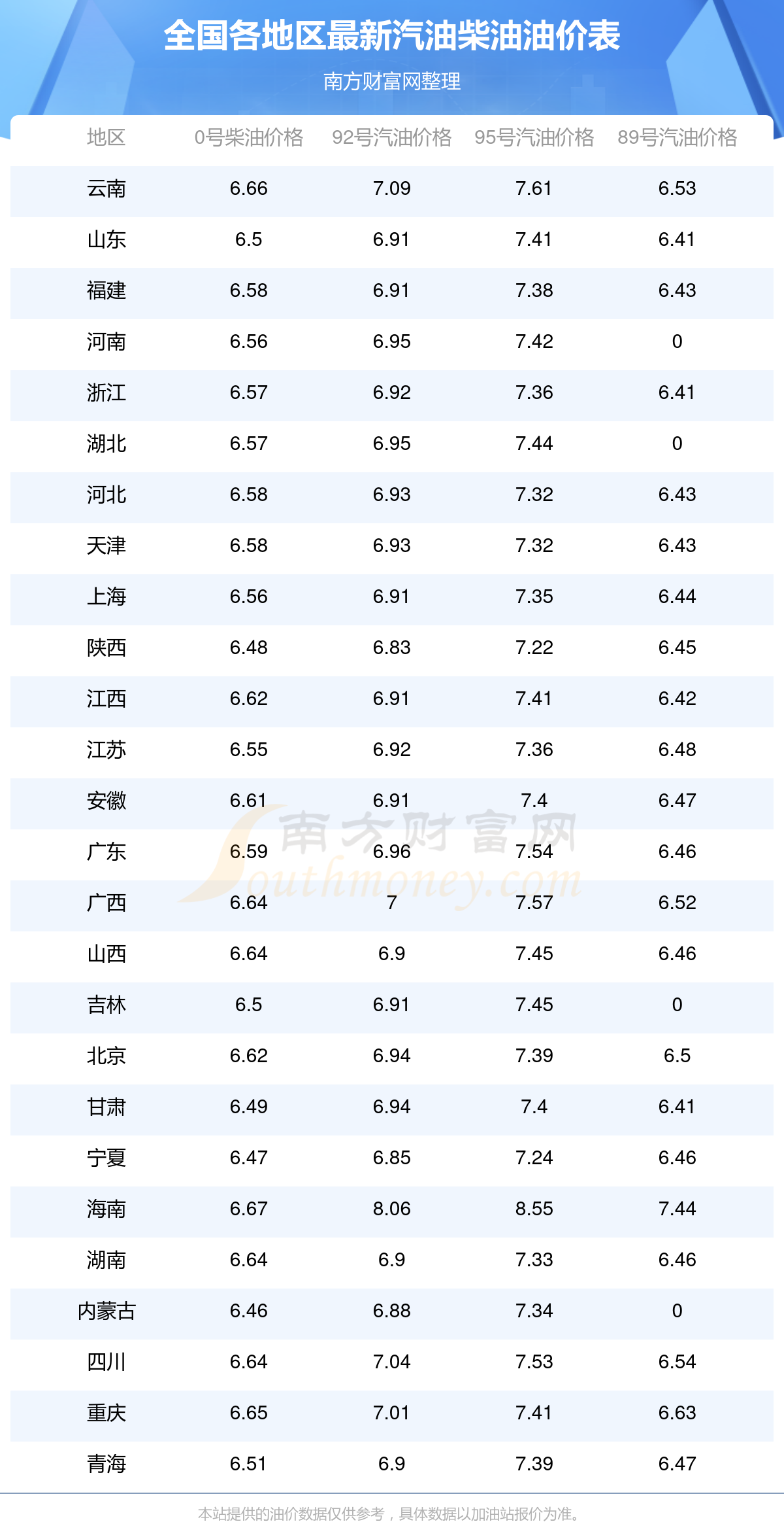 本輪油價調(diào)整時間為11月11日 ,調(diào)整后全國油價詳情為: