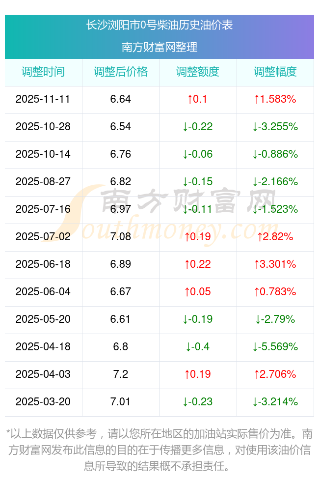 11月16日長沙瀏陽市0號柴油歷史油價一覽表