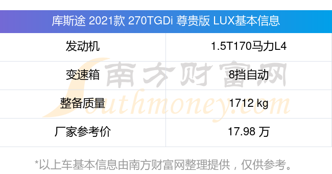 庫斯途 2021款 270TGDi 尊貴版 LUX動力上搭載的是一臺1.5T170馬力L4渦輪增壓發(fā)動機(jī),匹配8擋自動檔變速箱,燃料形式為汽油,常規(guī)整備質(zhì)量1712kg,廠家參考價17.98萬元。