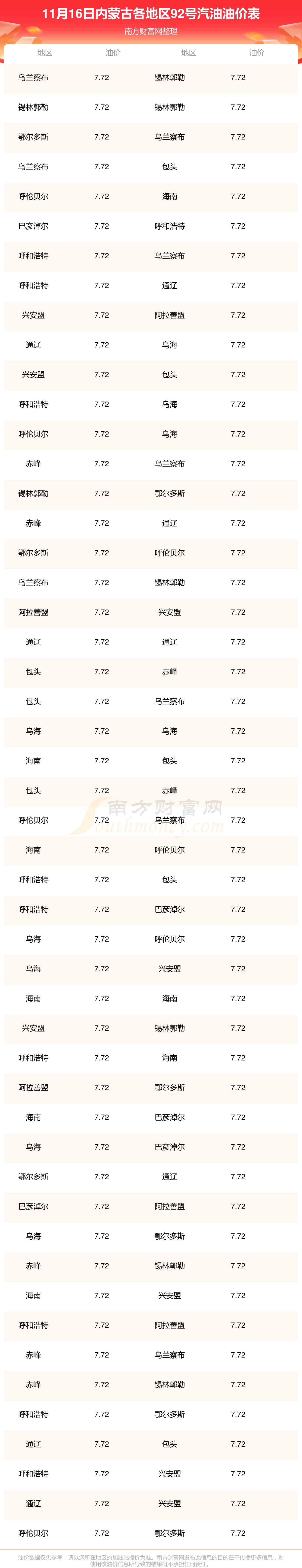 2025年11月16日內(nèi)蒙古92號汽油最新價格一覽表