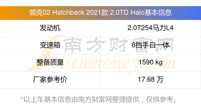 在動力上,領(lǐng)克02 Hatchback 2021款 2.0TD Halo配備的是一臺2.0T254馬力L4渦輪增壓發(fā)動機,匹配的是8擋手自一體自動檔變速箱,燃料形式為汽油,常規(guī)整備質(zhì)量1590kg,廠家參考價17.68萬元。