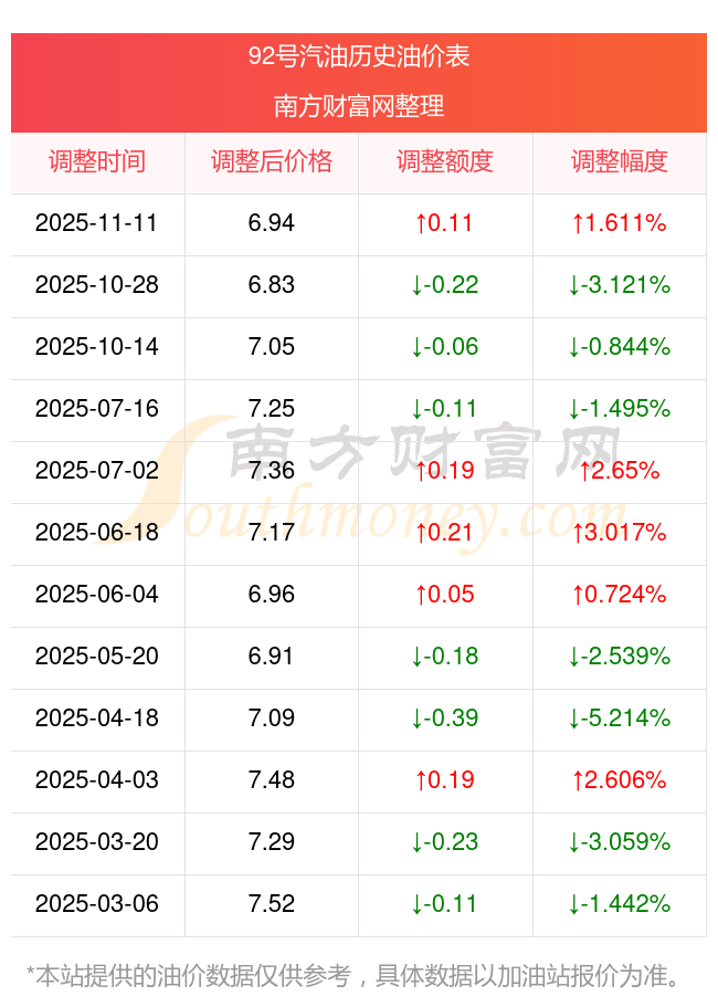 汽油、柴油11月16日每升的價(jià)格(油價(jià)調(diào)整時(shí)間11月11日):92號(hào)汽油6.94元;95號(hào)汽油7.4元;89號(hào)汽油6.41元;0號(hào)柴油6.49元。下一輪油價(jià)調(diào)整時(shí)間11月24日24時(shí),距離現(xiàn)在還有8.6天。