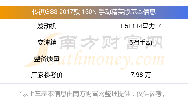 在動(dòng)力上,傳祺GS3 2017款 150N 手動(dòng)精英版配備的是一臺(tái)1.5L114馬力L4自然吸氣發(fā)動(dòng)機(jī),匹配的是5擋手動(dòng)擋變速箱,燃料形式為汽油,廠家參考價(jià)7.98萬元。