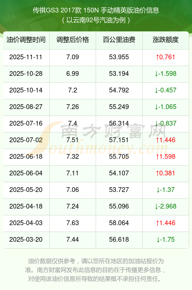 按11月11日92號(hào)汽油最新調(diào)整價(jià)格7.09元每升來計(jì)算(以云南為例),該車型百公里平均油費(fèi)為53.955元,按上一輪10月28日調(diào)整價(jià)格6.99元每升來計(jì)算,百公里平均油費(fèi)為53.194元,對(duì)比上一輪多花0.761元,下一輪油價(jià)調(diào)整時(shí)間為11月24日24時(shí)。
