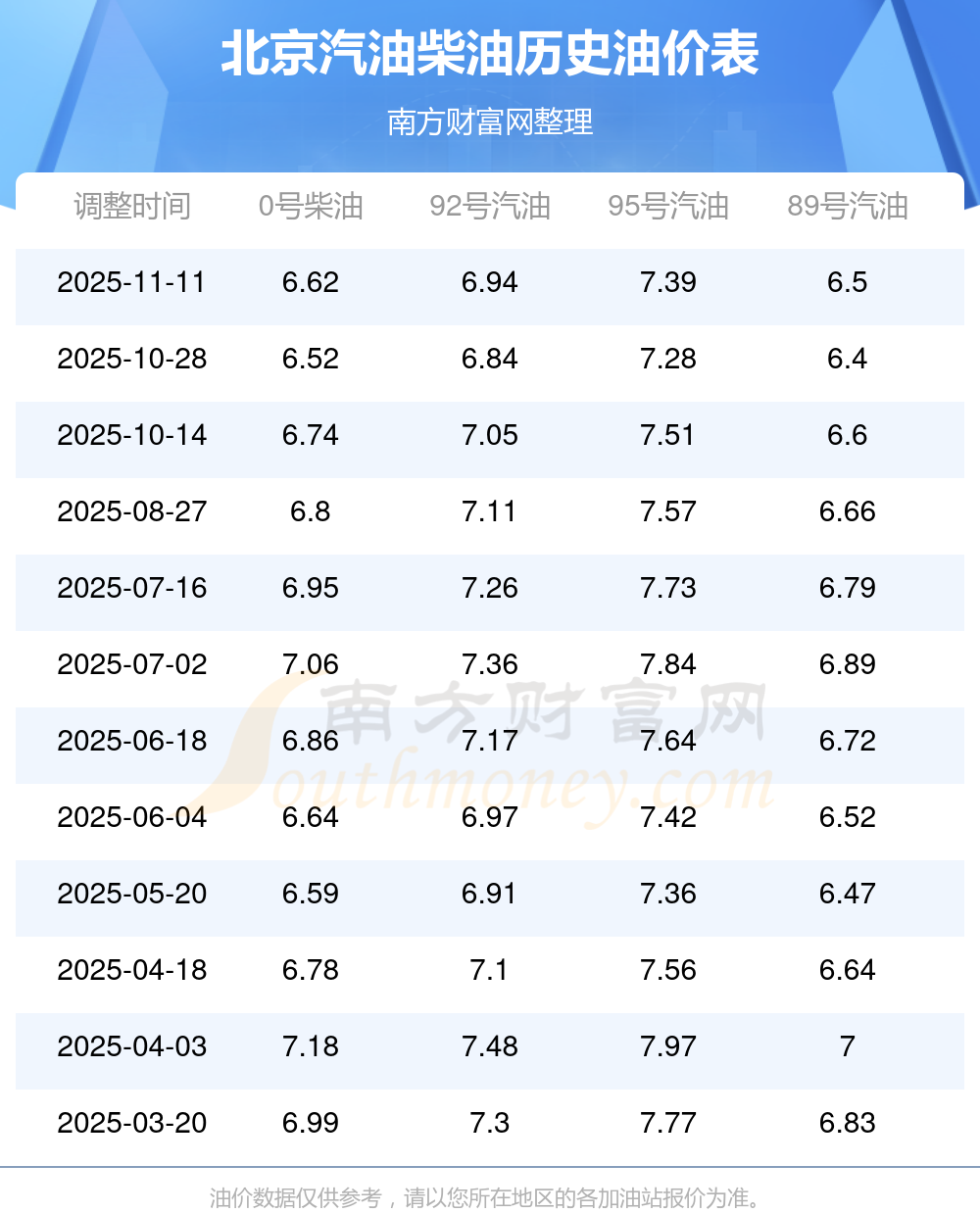 北京95號汽油11月16日價格為7.39元/升,調(diào)整時間為11月11日,相對上次調(diào)整漲了0.11元。
