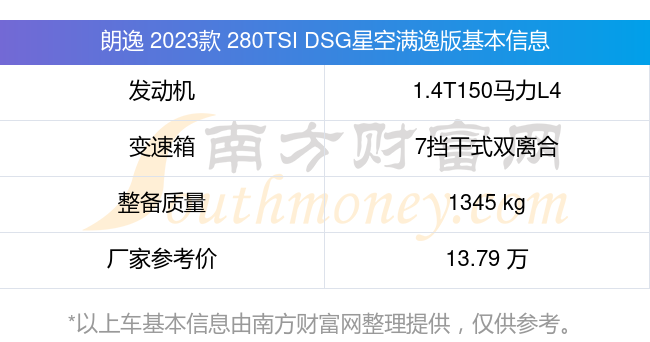 在動力上,朗逸 2023款 280TSI DSG星空滿逸版配備的是一臺1.4T150馬力L4渦輪增壓發(fā)動機,匹配的是7擋干式雙離合自動檔變速箱,燃料形式為汽油,常規(guī)整備質量1345kg,廠家參考價13.79萬元。