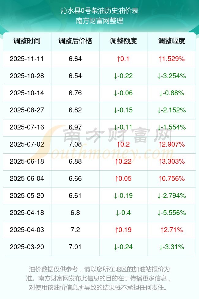 11月16日沁水縣0號柴油歷史油價(jià)一覽表