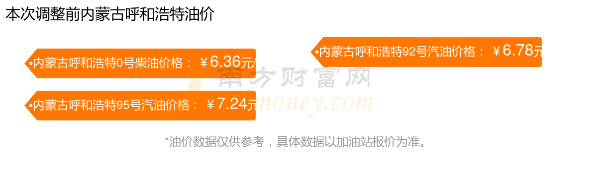 油價調(diào)整最新消息:內(nèi)蒙古呼和浩特汽油、柴油11月16日每升的價格為:92號汽油6.88元;95號汽油7.34元;0號柴油6.46元,本次油價調(diào)整時間是11月11日。內(nèi)蒙古呼和浩特下一輪油價調(diào)整時間11月24日24時,距離現(xiàn)在還有8.54天。