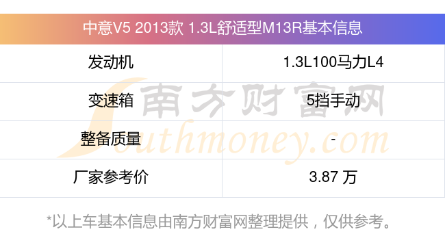 中意V5 2013款 1.3L舒適型M13R動力上配備的是一臺1.3L100馬力L4自然吸氣發(fā)動機,匹配的是5擋手動擋變速箱,燃料形式為汽油,廠家參考價3.87萬元。