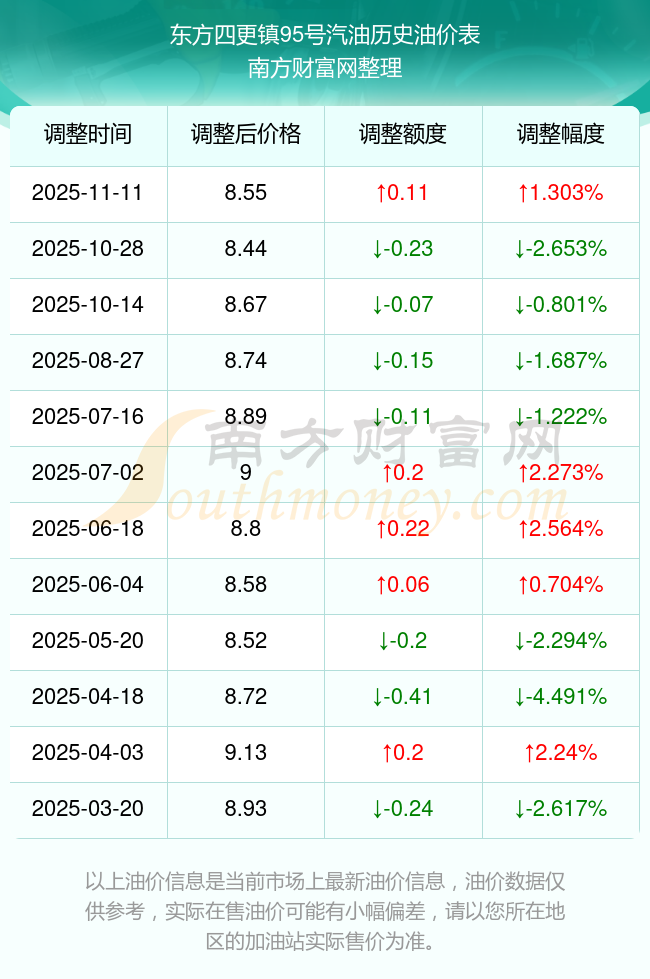 11月16日東方四更鎮(zhèn)95號汽油歷史油價一覽表