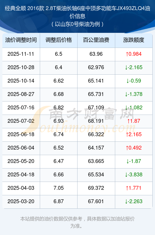 根據(jù)11月11日0號柴油最新調(diào)整價格6.5元/升來計算(以山東為例),該車型每百公里的平均油費是63.96元,上一輪10月28日調(diào)整價格6.4元每升來計算,每百公里的平均油費是62.976元,對比上一輪多花0.984元,下一輪的油價調(diào)整時間是11月24日24時。