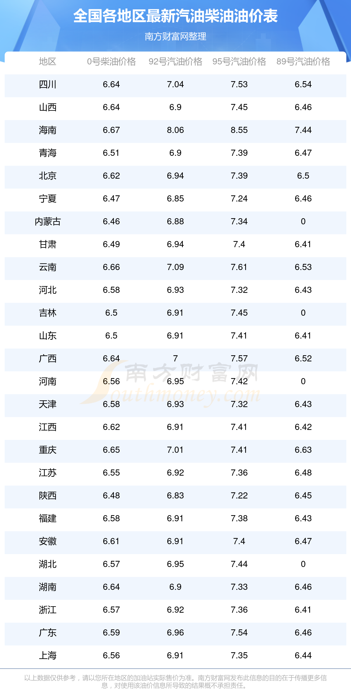 油價(jià)數(shù)據(jù)僅供參考,請以您所在地區(qū)的加油站報(bào)價(jià)為準(zhǔn)。南方財(cái)富網(wǎng)發(fā)布此信息的目的在于傳播更多信息,對使用該油價(jià)信息所導(dǎo)致的結(jié)果概不承擔(dān)任何責(zé)任。