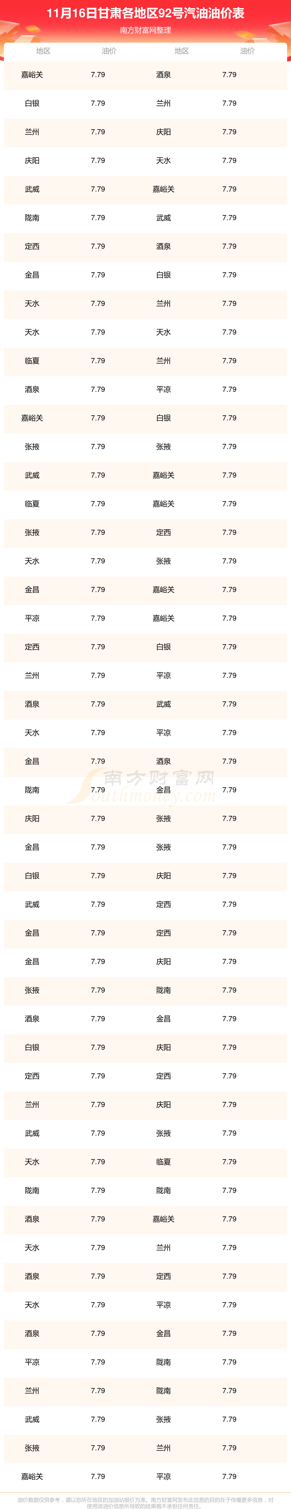 2025年11月16日甘肅92號汽油最新價(jià)格一覽表