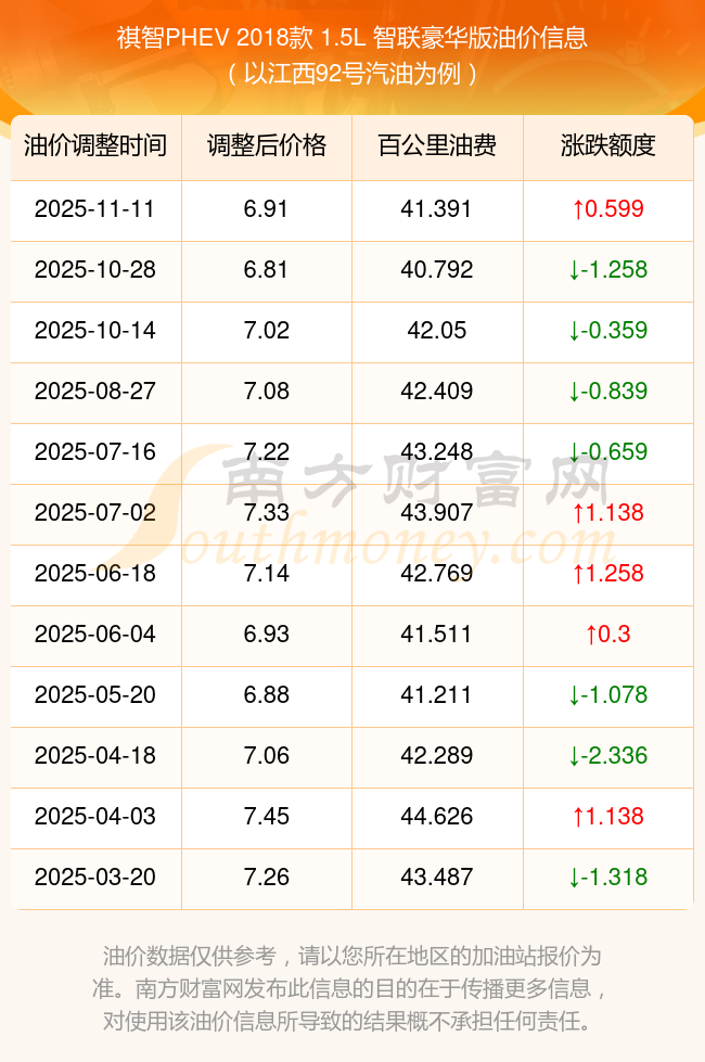 根據(jù)11月11日92號汽油最新調(diào)整價格6.91元/升來計算(以江西為例),該車型每百公里的平均油費是41.391元,上一輪10月28日調(diào)整價格6.81元每升來計算,每百公里的平均油費是40.792元,對比上一輪多花0.599元,下一輪的油價調(diào)整時間是11月24日24時。