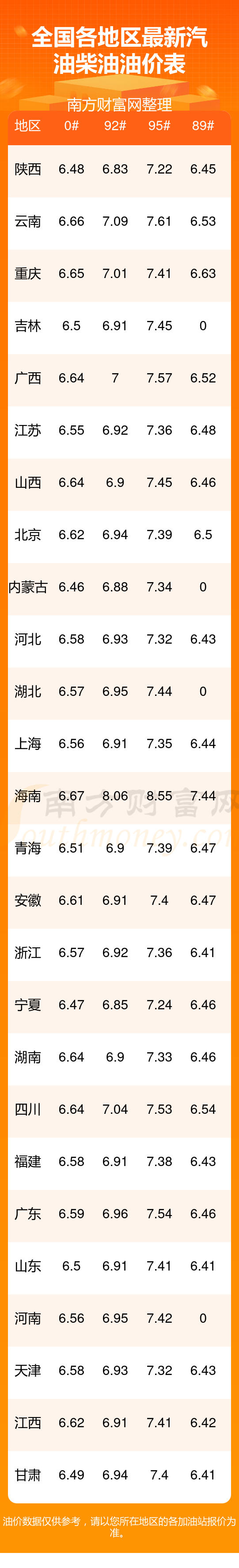 以上數(shù)據(jù)僅供參考,請(qǐng)以您所在地區(qū)的加油站實(shí)際售價(jià)為準(zhǔn)。南方財(cái)富網(wǎng)發(fā)布此信息的目的在于傳播更多信息,對(duì)使用該油價(jià)信息所導(dǎo)致的結(jié)果概不承擔(dān)責(zé)任。