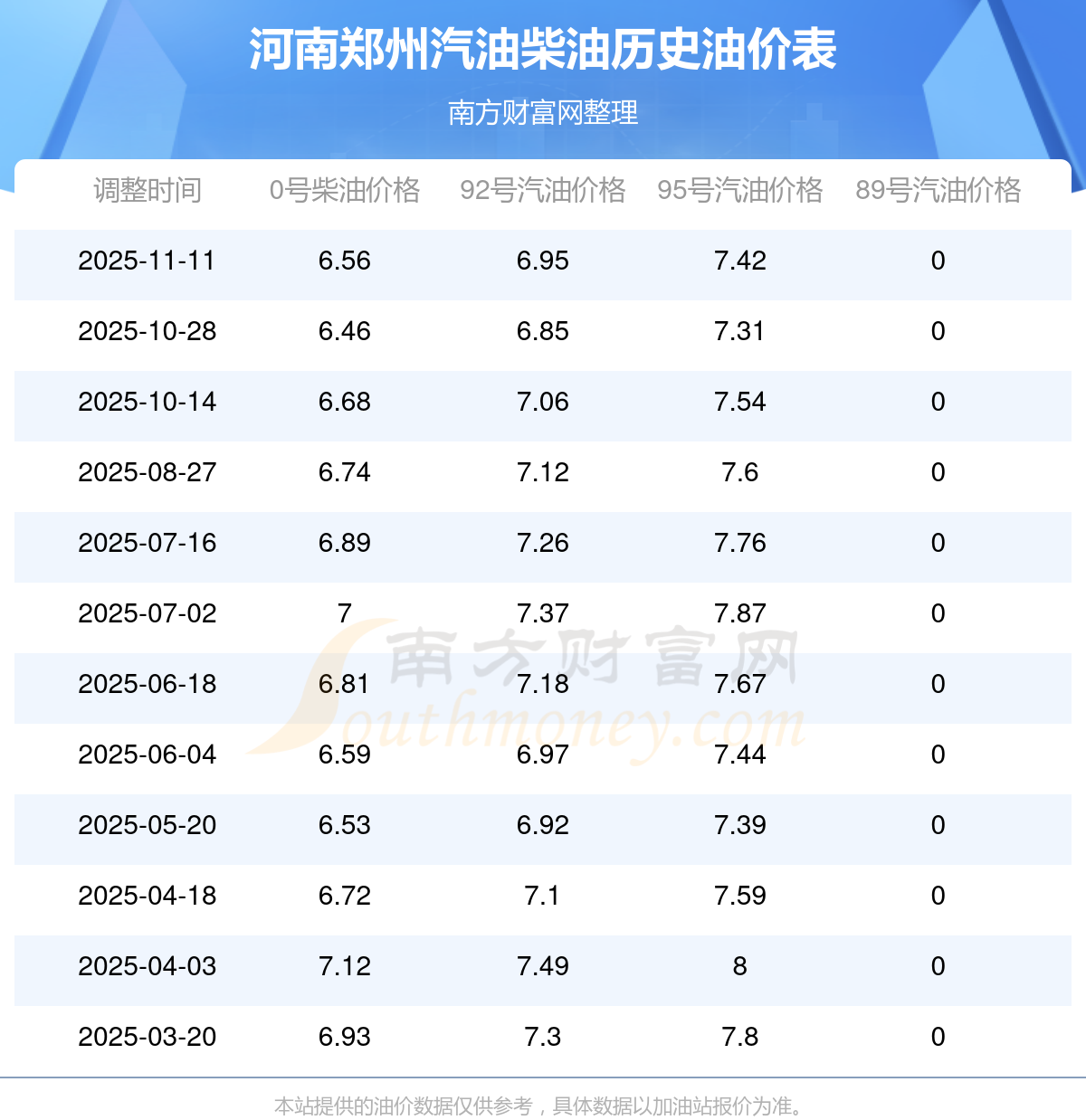 11月16日河南鄭州汽油、柴油每升的價(jià)格為:92號汽油為6.95元,增了0.1元;95號汽油為7.42元,增了0.11元;0號柴油為6.56元,增了0.1元,本輪油價(jià)的調(diào)整時(shí)間為11月11日。
