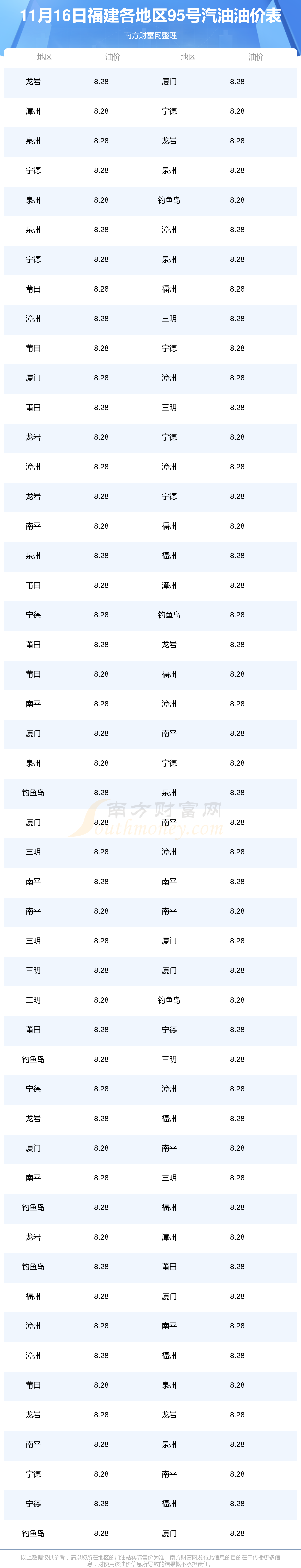 2025年11月16日福建95號(hào)汽油最新價(jià)格一覽表