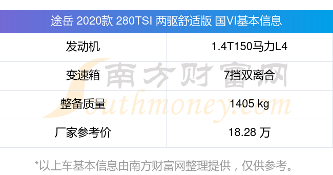 途岳 2020款 280TSI 兩驅(qū)舒適版 國(guó)VI動(dòng)力上搭載的是一臺(tái)1.4T150馬力L4渦輪增壓發(fā)動(dòng)機(jī),匹配7擋雙離合自動(dòng)檔變速箱,燃料形式為汽油,常規(guī)整備質(zhì)量1405kg,廠家參考價(jià)18.28萬(wàn)元。