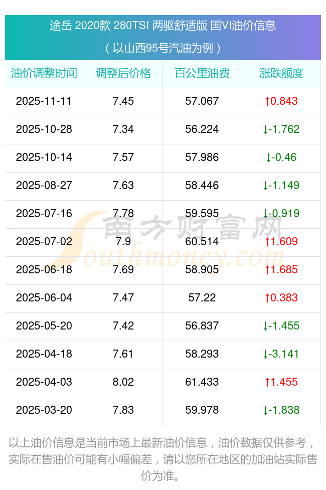 依照11月11日95號(hào)汽油最新調(diào)整價(jià)格7.45元/升來計(jì)算(以山西為例),該車型百公里的平均油費(fèi)是57.067元,依照上一輪10月28日調(diào)整價(jià)格7.34元/升來計(jì)算,百公里的平均油費(fèi)是56.224元,對(duì)比上一輪多花0.843元,下一輪的油價(jià)調(diào)整時(shí)間11月24日24時(shí)。