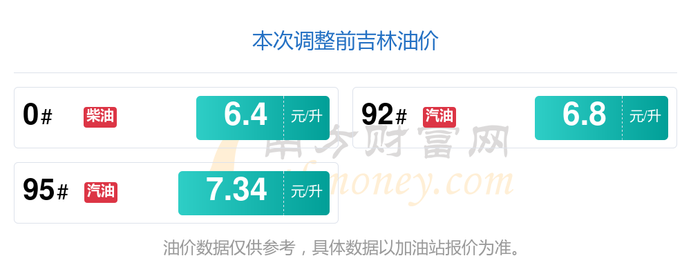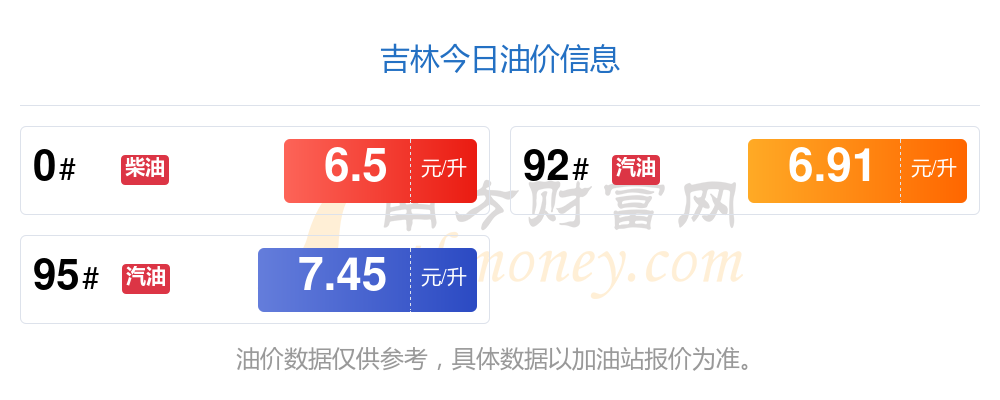 以上數(shù)據(jù)僅供參考,請(qǐng)以您所在地區(qū)的加油站實(shí)際售價(jià)為準(zhǔn)。南方財(cái)富網(wǎng)發(fā)布此信息的目的在于傳播更多信息,對(duì)使用該油價(jià)信息所導(dǎo)致的結(jié)果概不承擔(dān)責(zé)任。