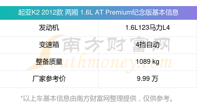 在動力方面,起亞K2 2012款 兩廂 1.6L AT Premium紀(jì)念版搭載的是一臺1.6L123馬力L4自然吸氣發(fā)動機,匹配4擋自動檔變速箱,燃料形式為汽油,常規(guī)整備質(zhì)量1089kg,廠家參考價9.99萬元。
