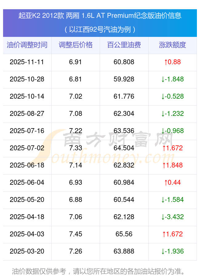 依照11月11日92號汽油最新調(diào)整價格6.91元/升來計算(以江西為例),該車型百公里的平均油費是60.808元,依照上一輪10月28日調(diào)整價格6.81元/升來計算,百公里的平均油費是59.928元,對比上一輪多花0.88元,下一輪的油價調(diào)整時間11月24日24時。