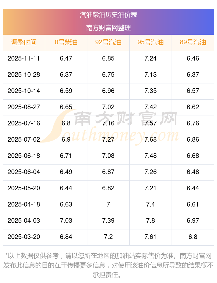 2025年95號汽油價(jià)格一覽表