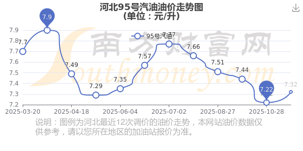 11月16日,河北95號(hào)汽油的價(jià)格是7.32元每升,本次的調(diào)整時(shí)間為11月11日,對(duì)比上次的調(diào)整升了0.1元,升1.385%,11月24日24時(shí)為下一輪油價(jià)調(diào)整時(shí)間,還有8.41天。